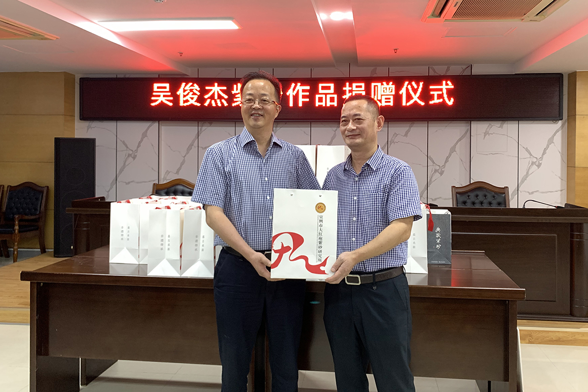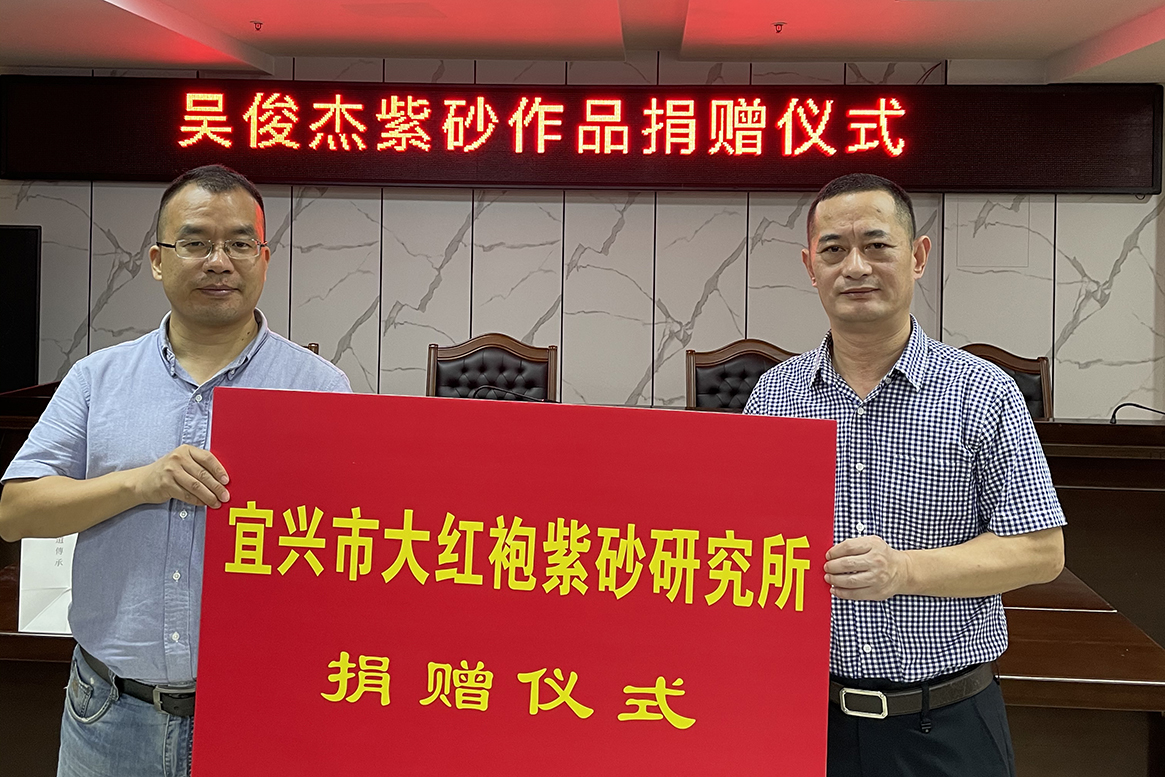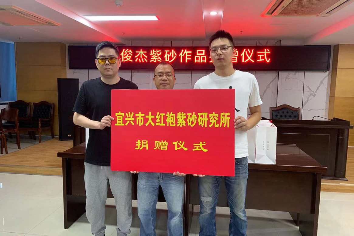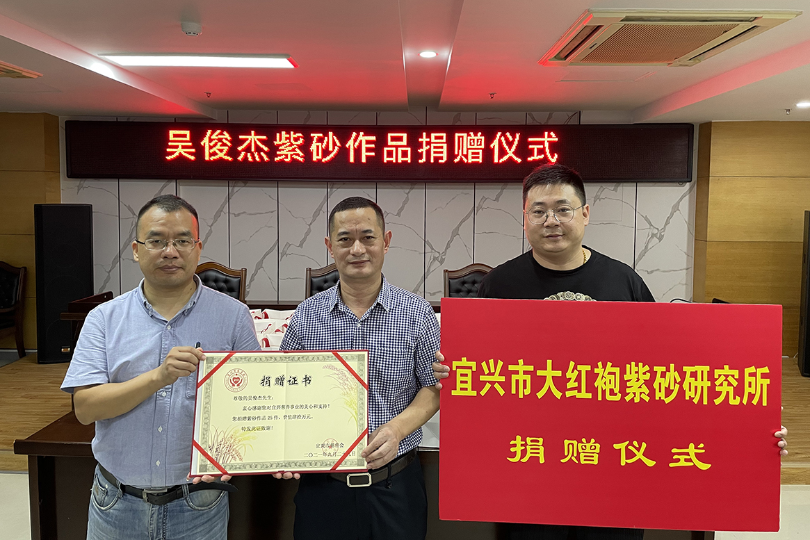 2021年9月29日,爱心陶艺家吴俊杰代表宜兴市大红袍紫砂研究所向宜兴市慈善会捐赠了32件紫砂作品(紫砂壶)。其中,吴俊杰一人就捐赠了25件,创造了宜兴市慈善会单次捐赠紫砂艺术品数量的记录。宜兴市民政局为他们颁发了捐赠证书。