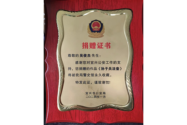 2024年1月8日,在宜兴市公安局举行的“陶韵-警魂 陶艺名家作品捐赠仪式”上,宜兴市大红袍紫砂研究所向宜兴市公安局捐赠紫砂作品《孙子兵法壶》,并赠送