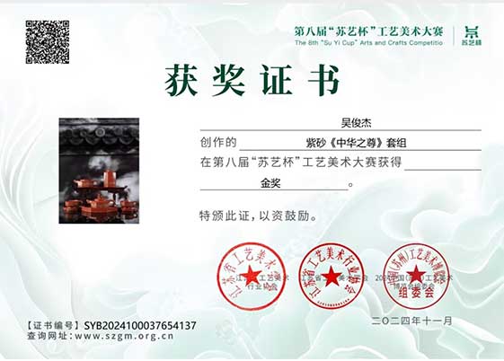 宜兴市大红袍紫砂研究所所长吴俊杰先生代表研究所,参加了2024中国(苏州)工艺美术博览会暨第八届“苏艺杯”工艺美术大赛,其紫砂作品《中华之尊》套组喜获金奖。