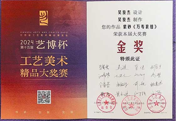 宜兴市大红袍紫砂研究所所长吴俊杰先生代表研究所,参加了第十五届“艺博杯”工艺美术精品大奖赛暨工艺美术精品博览会,其紫砂作品《万寿套组》荣获金奖。